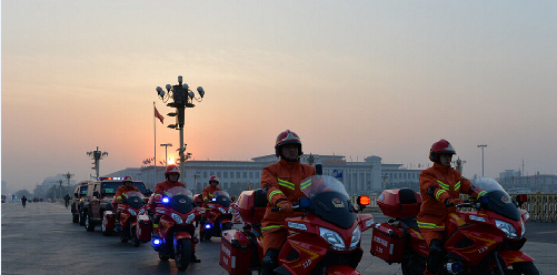 據報道 北京天安門配置新型消防摩托消防裝備。